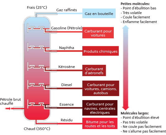 Une raffinerie est une usine qui a pour but de séparer les différents constituants du pétrole. Cette transformation se fait en plusieurs étapes. Il faut d’abord distiller le pétrole en le chauffant à 400°C. Cette transformation s’appelle la distillation fractionnée.